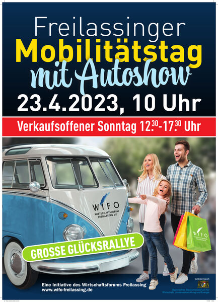 Das WIFO veranstaltet den Mobilitätstag mit Autoshow am 23. April zusammen mit dem ersten von vier verkaufsoffenen Sonntagen in Freilassing. 20 Aussteller präsentieren Ihre Neuheiten. Neufahrzeuge und jeglichen Zubehör gibt es an diesem Tag zu bestaunen. Der Projektleiter Adrian Winkler hat zusammen mit dem Wirtschaftsforum Freilassing e.V. (Wifo) ein großes Programm für die ganze Familie vorbereitet. Auch in diesem Jahr liegt der Fokus auf E-Mobilität. Die Geschäfte öffnen von 12.30 Uhr bis 17.30 Uhr.