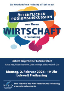 Das Wirtschaftsforum Freilassing e. V. lädt alle Bürgerinnen und Bürger herzlich ein, die Kandidat:innen persönlich kennenzulernen, ihre Positionen zu vergleichen und Fragen zu stellen.